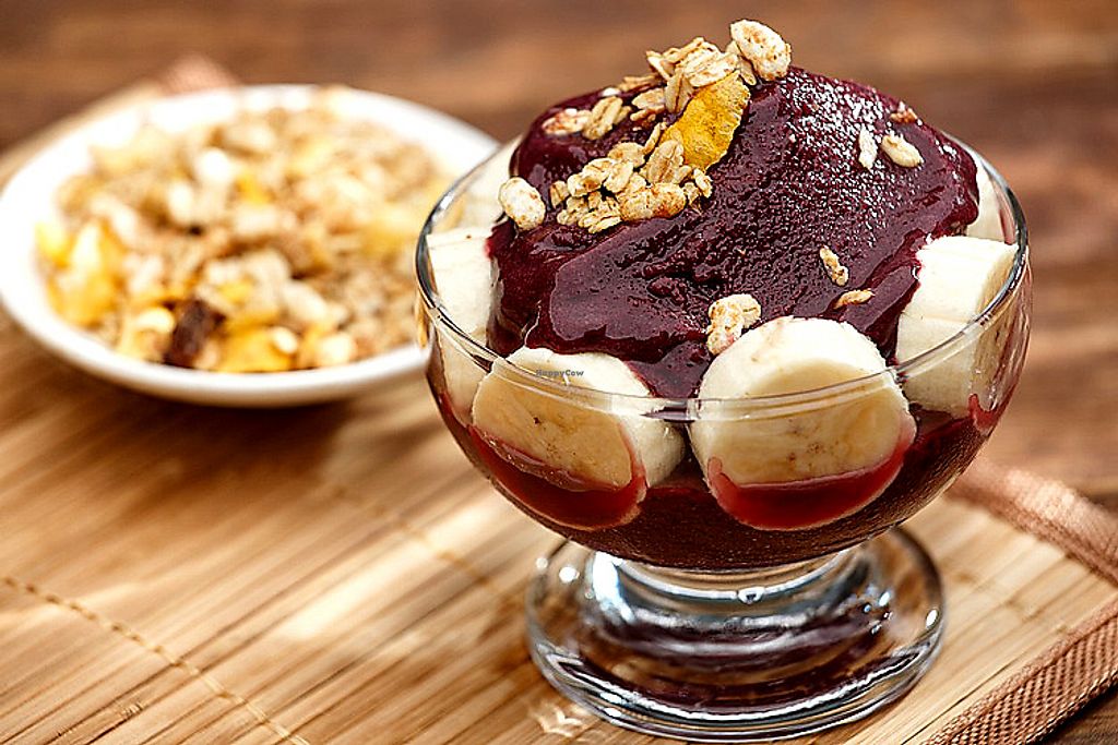 Premium açaí with banana slices, granola. Accompanies a "molecular" sp…