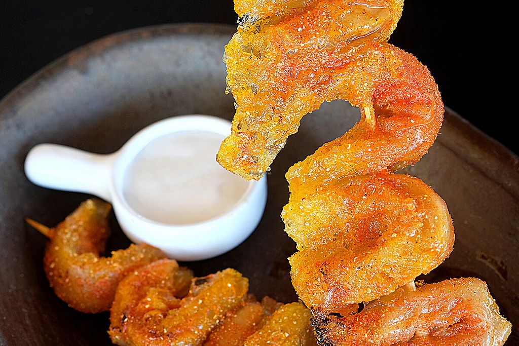 Vegan shrimp breaded in rice leaf, with french fries and heart of palm…