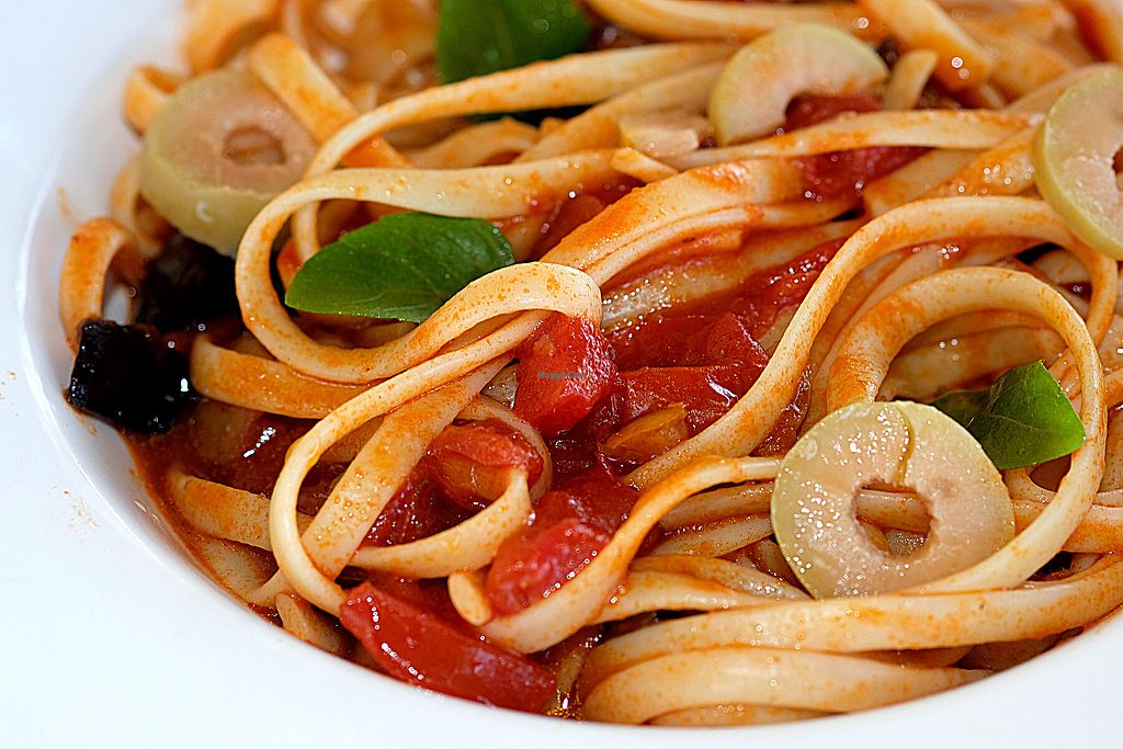 Tagliatelle with homemade tomato sauce, sautéed eggplants, olives and …