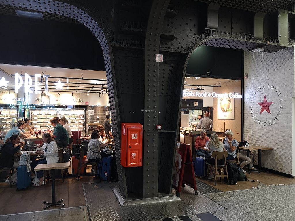 Serves meat, vegan options available. UK based international chain advertising natural food and organic coffee. Offers ready-to-eat prepackaged foods and drinks, including items like smoothies, bottled juices, porridge, coconut milk yogurt with granola, falafel and hummus salad, fruit salad, baguette sandwiches, wraps, and soups. Vegan items labeled. Est. 1983 and commonly referred to as just Pret. Removed March 2023: Limited vegan options.