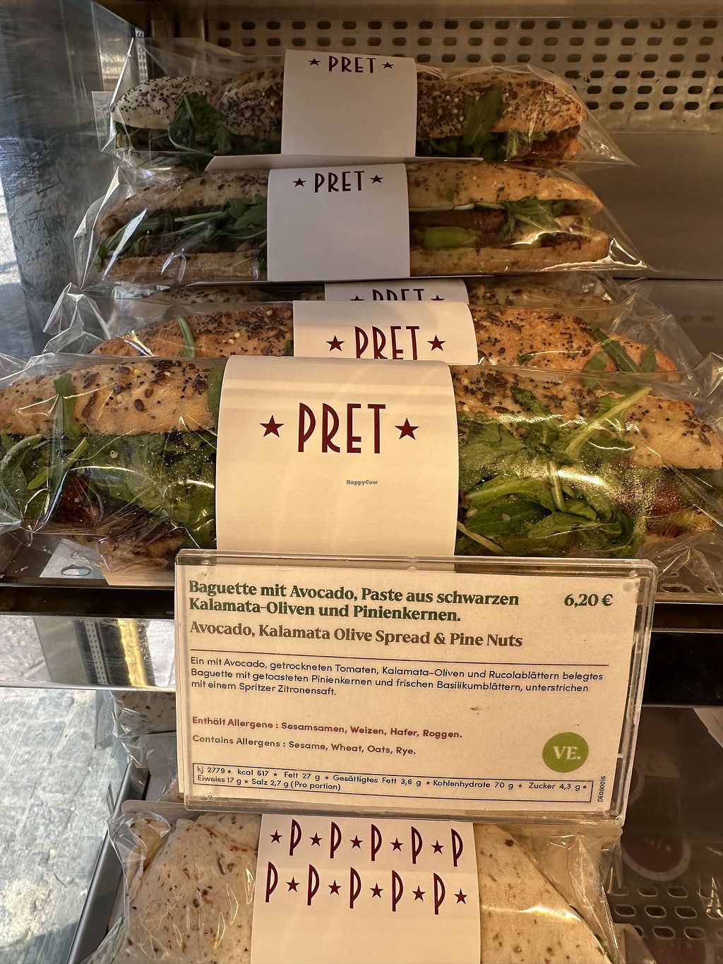Serves meat, vegan options available. UK based international chain advertising natural food and organic coffee. Offers ready-to-eat prepackaged foods and drinks, including items like smoothies, bottled juices, porridge, coconut milk yogurt with granola, falafel and hummus salad, fruit salad, baguette sandwiches, wraps, and soups. Vegan items labeled. Est. 1983 and commonly referred to as just Pret. Open Mon-Fri 07:00-20:00, Sat 08:00-20:00, Sun 09:00-20:00.
