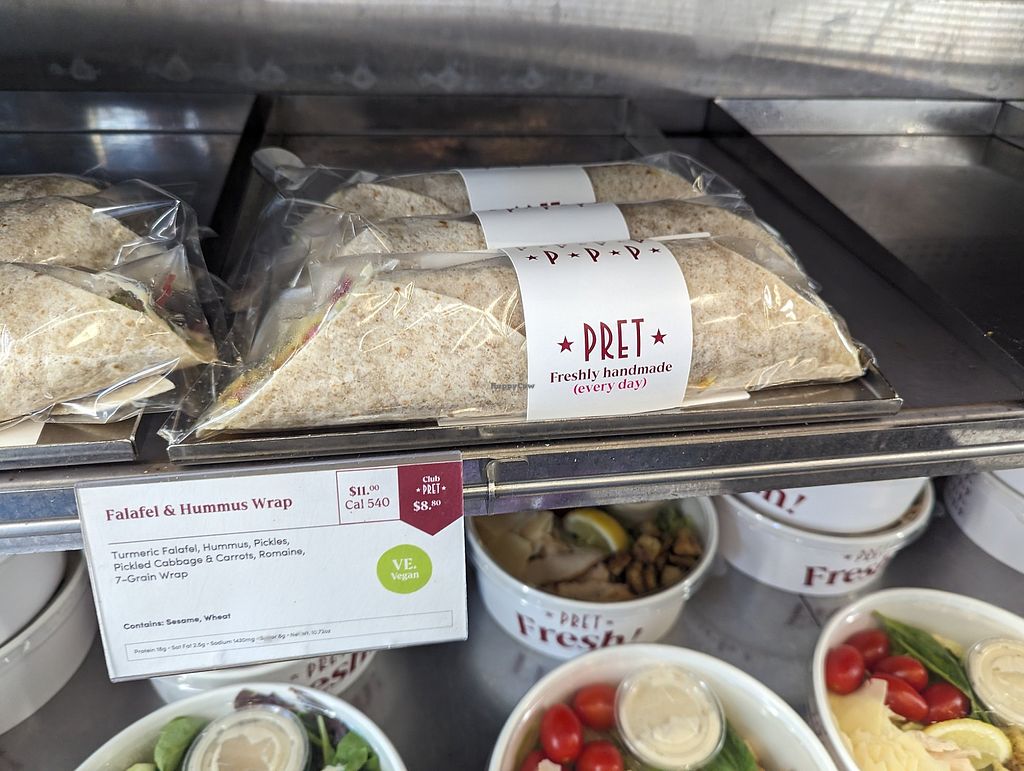 Serves meat, vegan options available. UK based international chain advertising natural food and organic coffee. Offers ready-to-eat prepackaged foods and drinks, including items like smoothies, bottled juices, porridge, coconut milk yogurt with granola, falafel and hummus salad, fruit salad, baguette sandwiches, wraps, and soups. Vegan items labeled. Est. 1983 and commonly referred to as just Pret. Open Mon-Fri 6:00am-9:00pm, Sat 8:00am-7:00pm, Sun 8:00am-6:00pm.