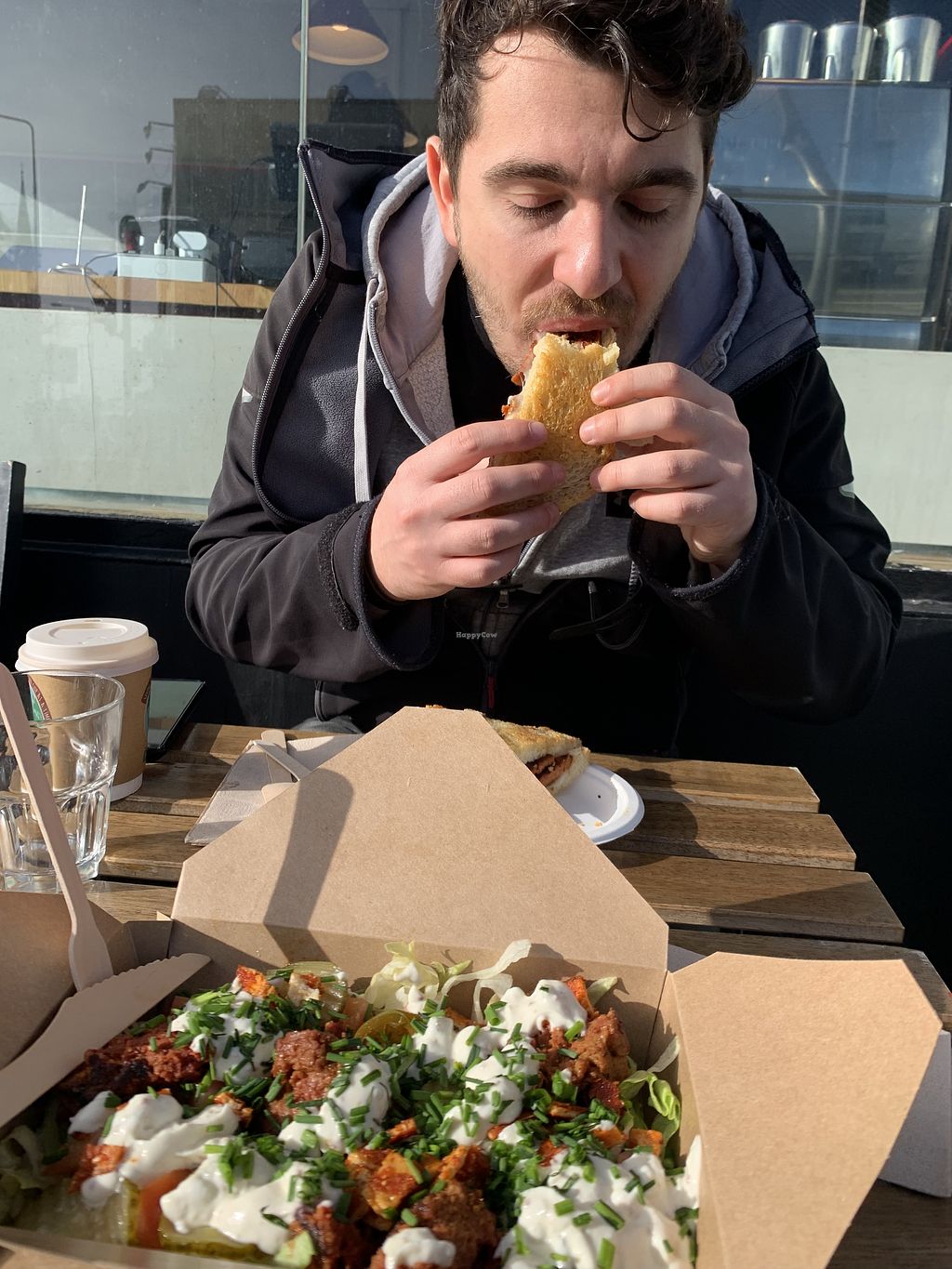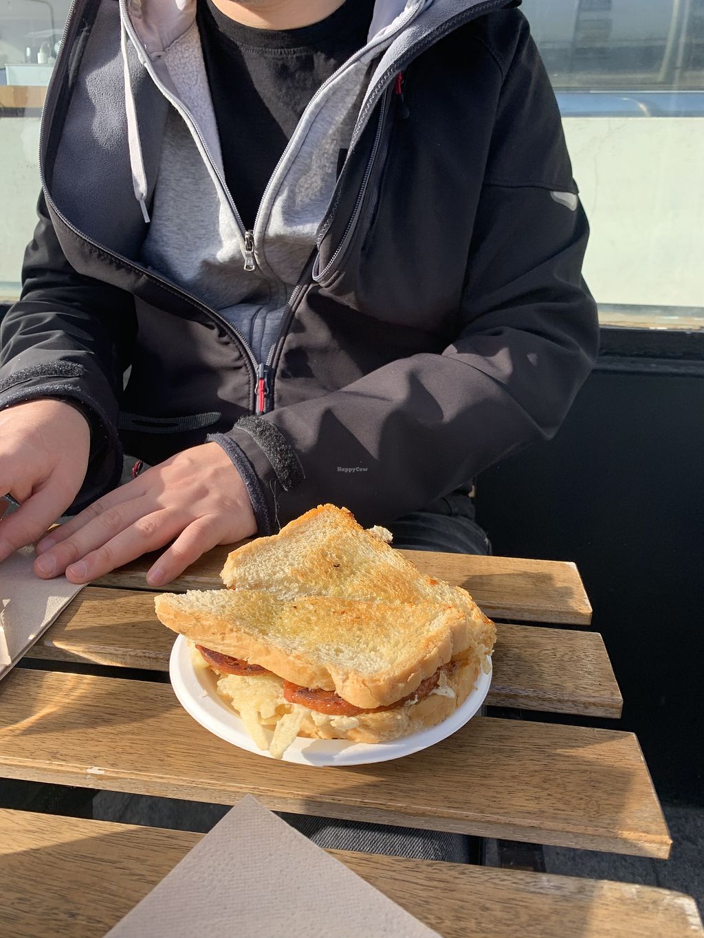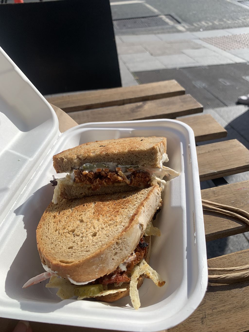 Vegan “steak” toastie with lettuce, tomato, coleslaw and mustard