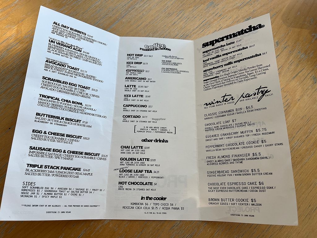 Wow! Super impressed with this coffee shop that has 100% vegan food for breakfast and lunch. Strangely there’s only one paper menu with the menu options but you can take it to your table to decide. Then you go back to the counter to order. Their pancakes were outrageously good with blackberry and lemon jam and maple infused butter. The all day burrito was equally awesome with yummy ‘egg’, home fries, onion, avocado, greens and a spicy Chimichurri sauce for dipping to your hearts content. The iced oat latte was quite strong for me but normally I take decaf. I liked it still but was lightheaded afterwards, doh. The pastries looked so amazing I had to take home three to try as we were so stuffed from just the breakfast. Loved this place so much again on second visit! Couldn’t stop myself getting the pancakes and all day burrito again. Tried some lattes and the sausage egg and cheese biscuit which was good but not my favorite.