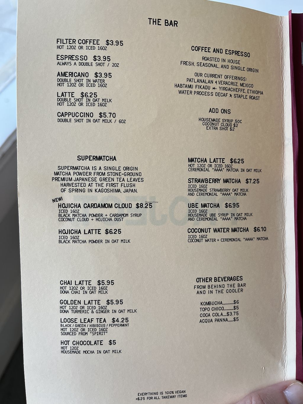 Vegan coffee cafe with a small kitchen that makes toasts and salads. Offers daily baked goods. Est. 2019. Open Mon-Sun 8:00am-4:00pm.