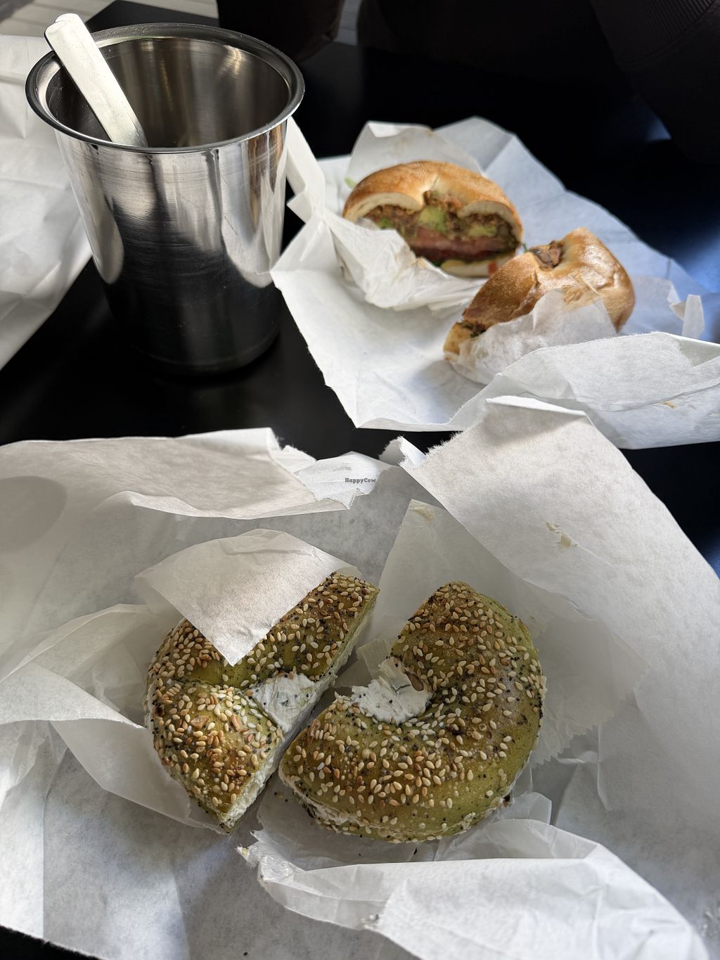 Tasty everything bagel with vegan scallion cream cheese. Over delivered. Cut and smeared like a true NYC bagel. If you love bagels, go there!