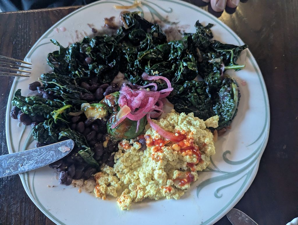 Tofu scramble plate was greasy. So greasy I complained and was given an overly sweet cinnamon bun/roll. 🙂