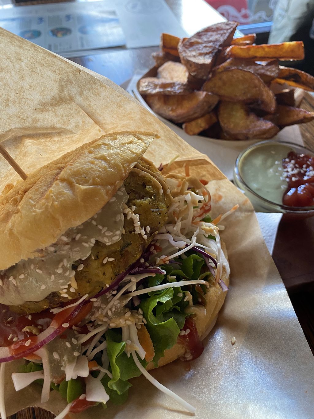 Hummus, potato wedges with sauces and one burger (cut in half)