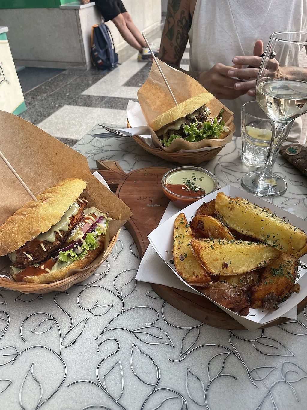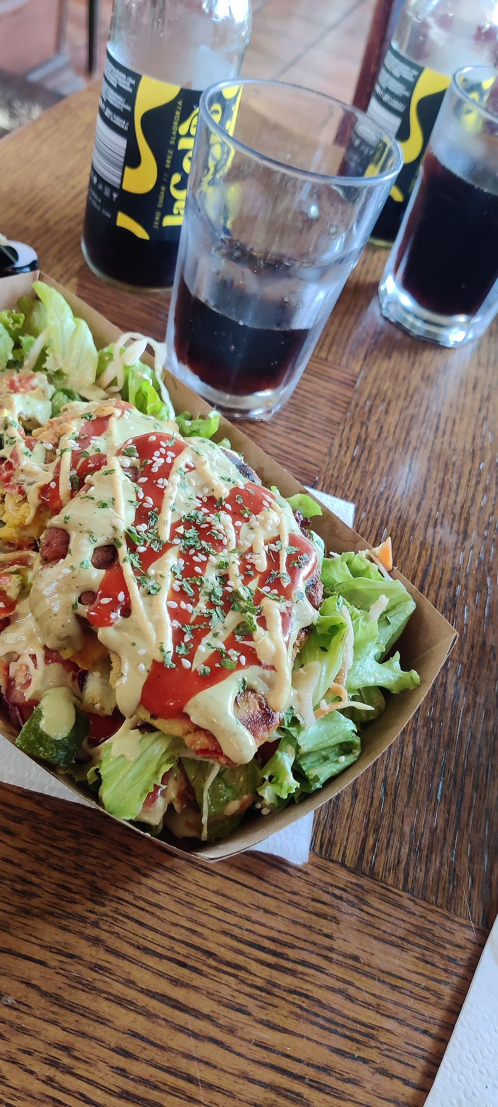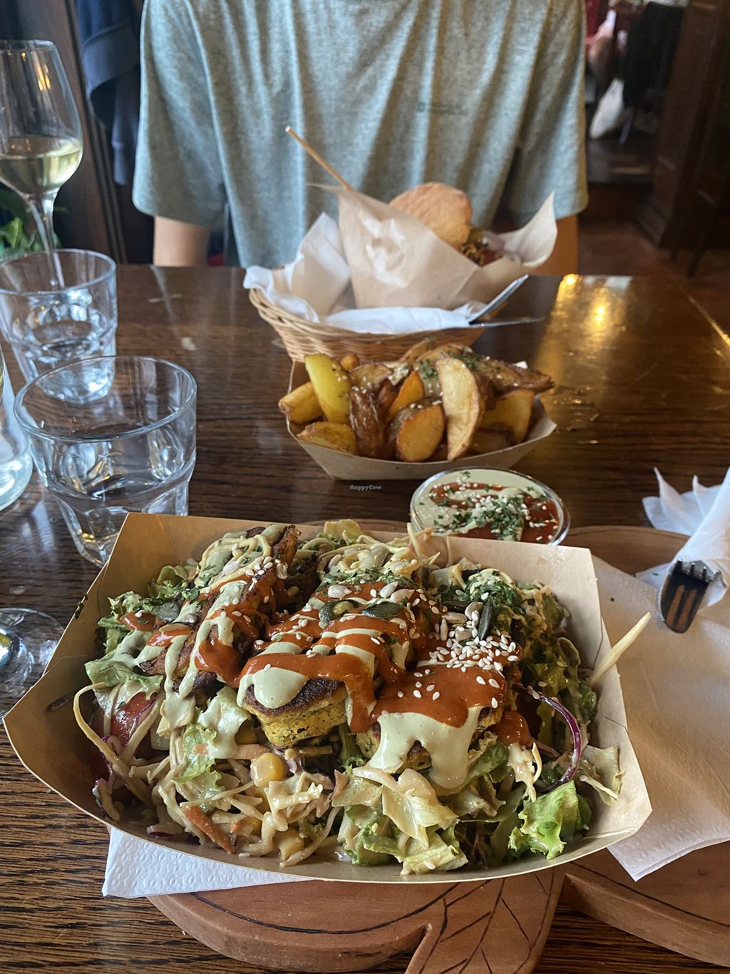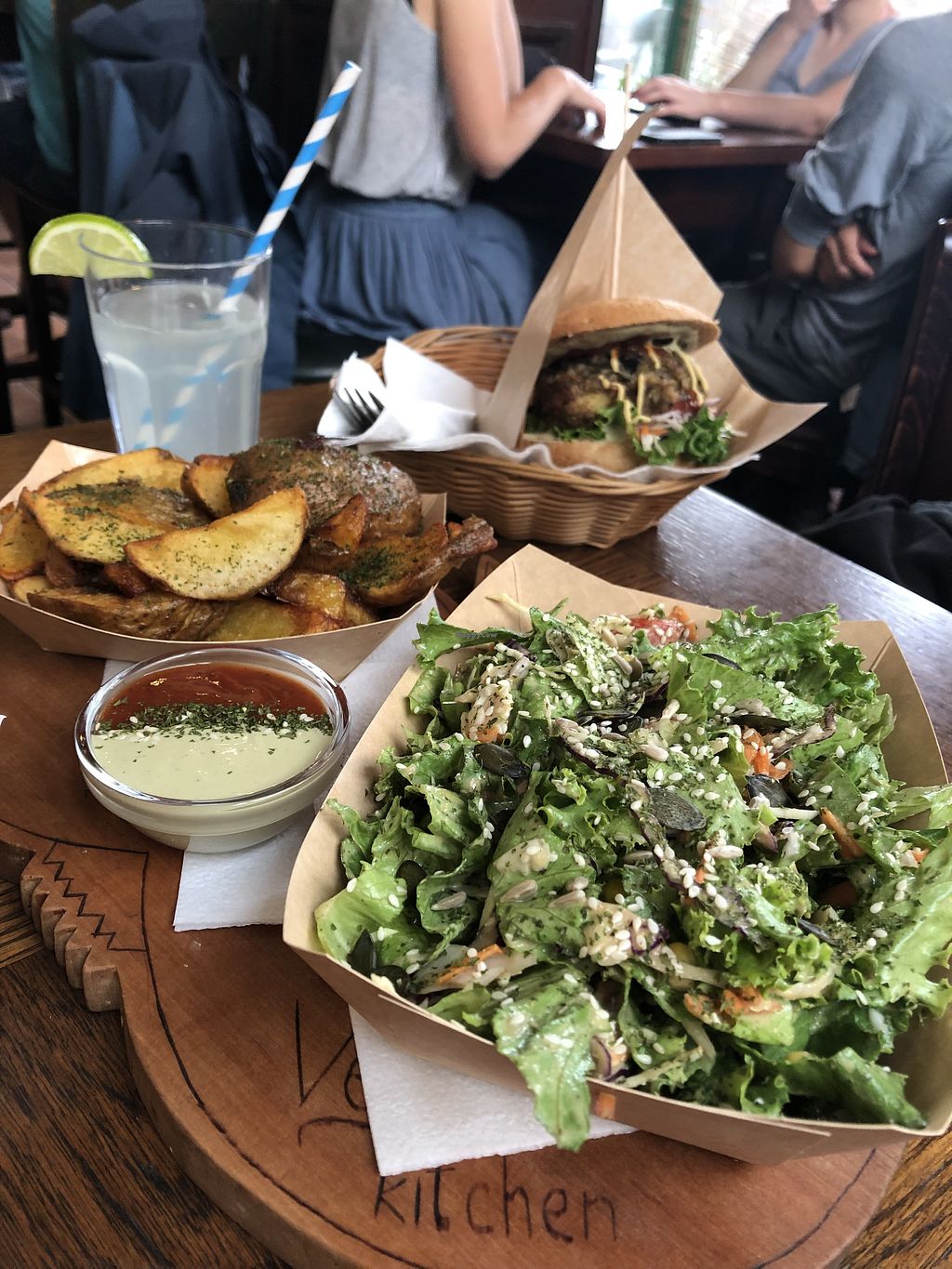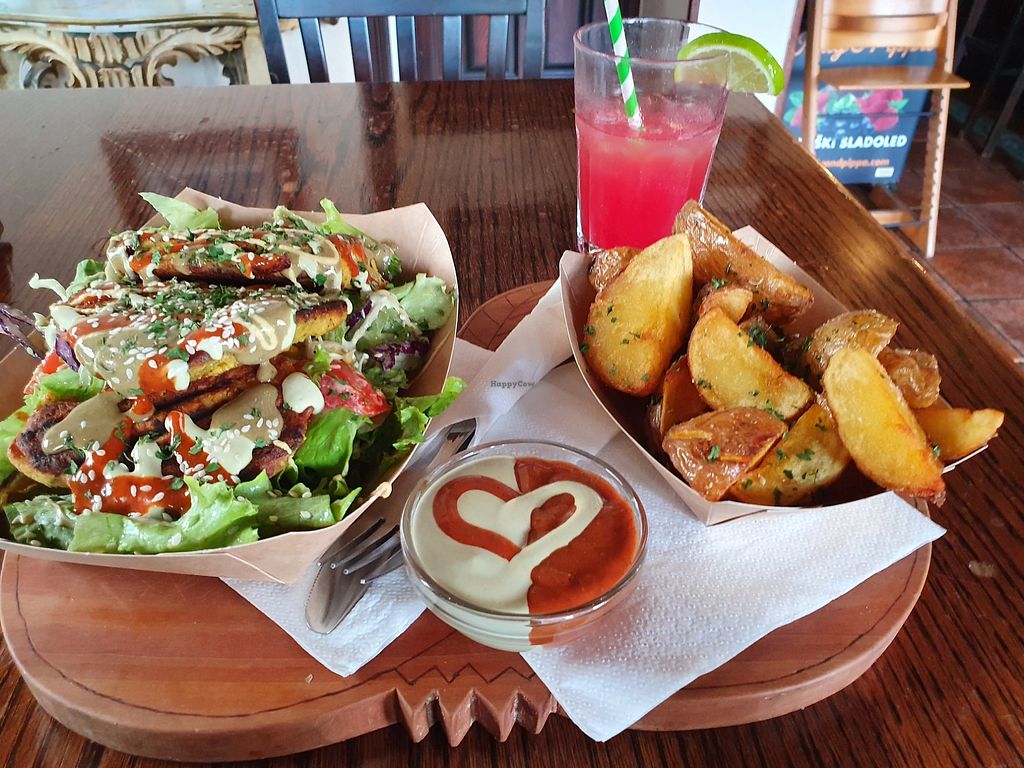 Chickpea fritters and salad + potato wedges, delicious sauce and water…