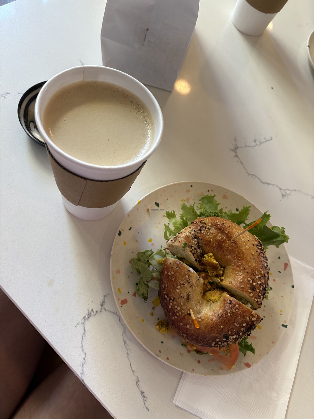 Maple latte and bagel sandwich with veggies, tofu scramble and vegan c…