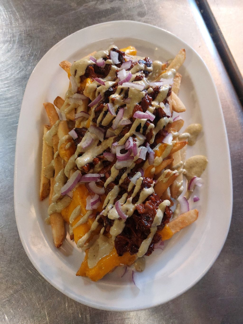Fries Guy: Fries topped WITH BBQ jackfruit, vegan cheddar cheese, roas…
