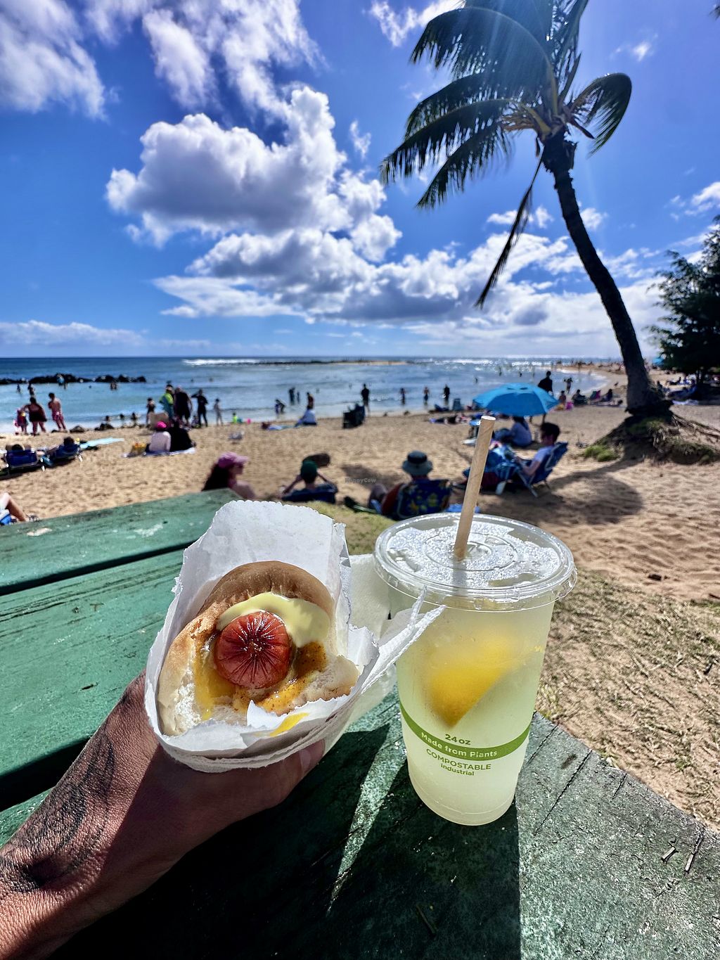 Veggie dog with pineapple relish and Hawaiian mustard