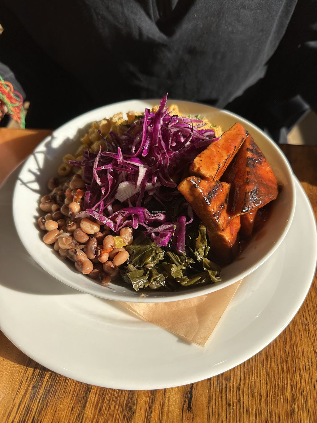 The mac & cheese definitely left a lot to be desired. My first bite was a huge letdown. I literally said “come on man.” 😂 I really wanted it to be good! It had almost no flavor or salt whatsoever, just a faint smokiness. Most of the flavor came from the BBQ sauce on the tempeh, which was an addition that I requested. The tempeh appeared as if they just poured a little sauce on some slices of tempeh and called it a day. Some caramelization on the tempeh would have done wonders. This dish really disappointed me because I made a fantastic mac and “cheese” this weekend at home and this didn’t even come close. I had some leftover “cheese” sauce in my fridge, and when I added it to my leftovers, it completely changed the game!