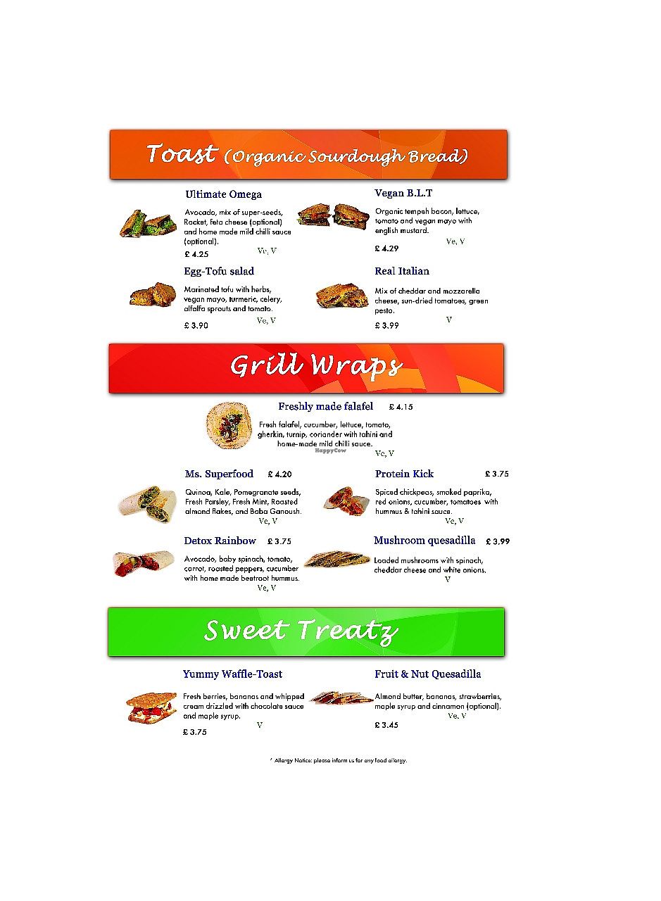 Wide range of Vegan options....Healthy Salads, soups, Wraps, Hot Vegan Food boxes, Falafel, Juices, Smoothies.....i can keep writing as they got loads of options.
