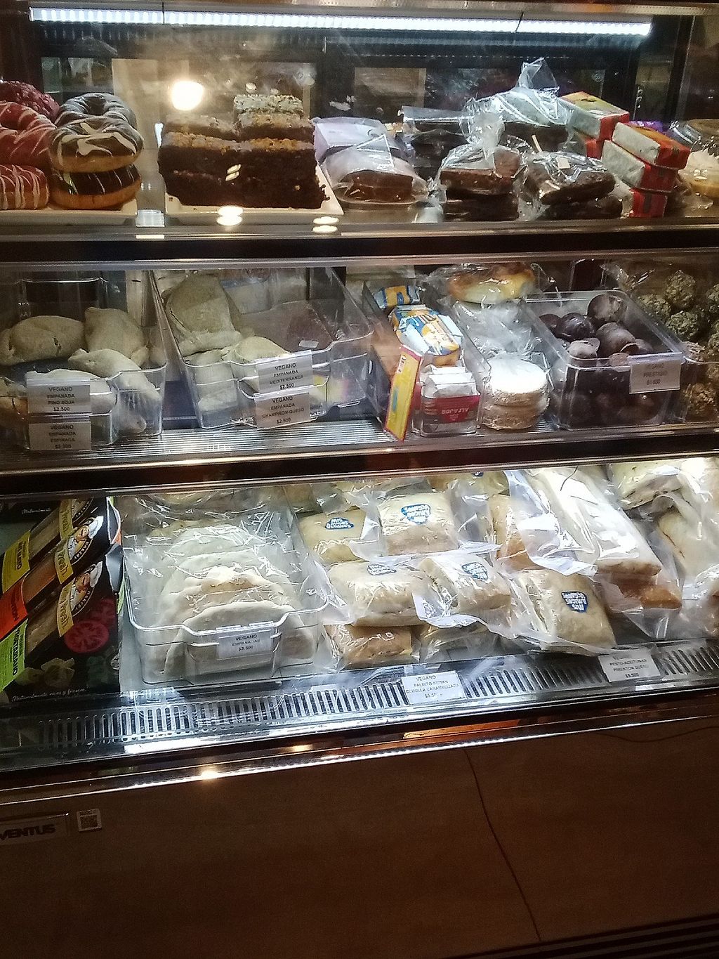 They have got an entire fridge with clearly labeled vegan food such as seitan burgers and sandwiches, empanadas but also sweets such as alfajores and brownies. All products are from the same exclusively vegan company "mis amigos veganos"