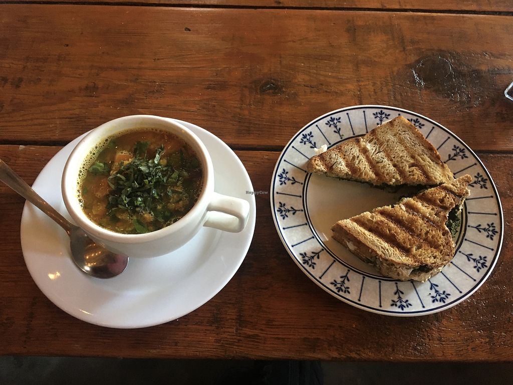 Red Lentil Veggie Soup and Pesto Sandwich with melted vegan mozzarella…