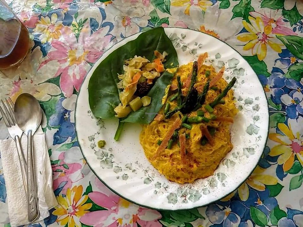 Rice noodles with asparagus, coconut bacon, fermented vegetables, raw/…