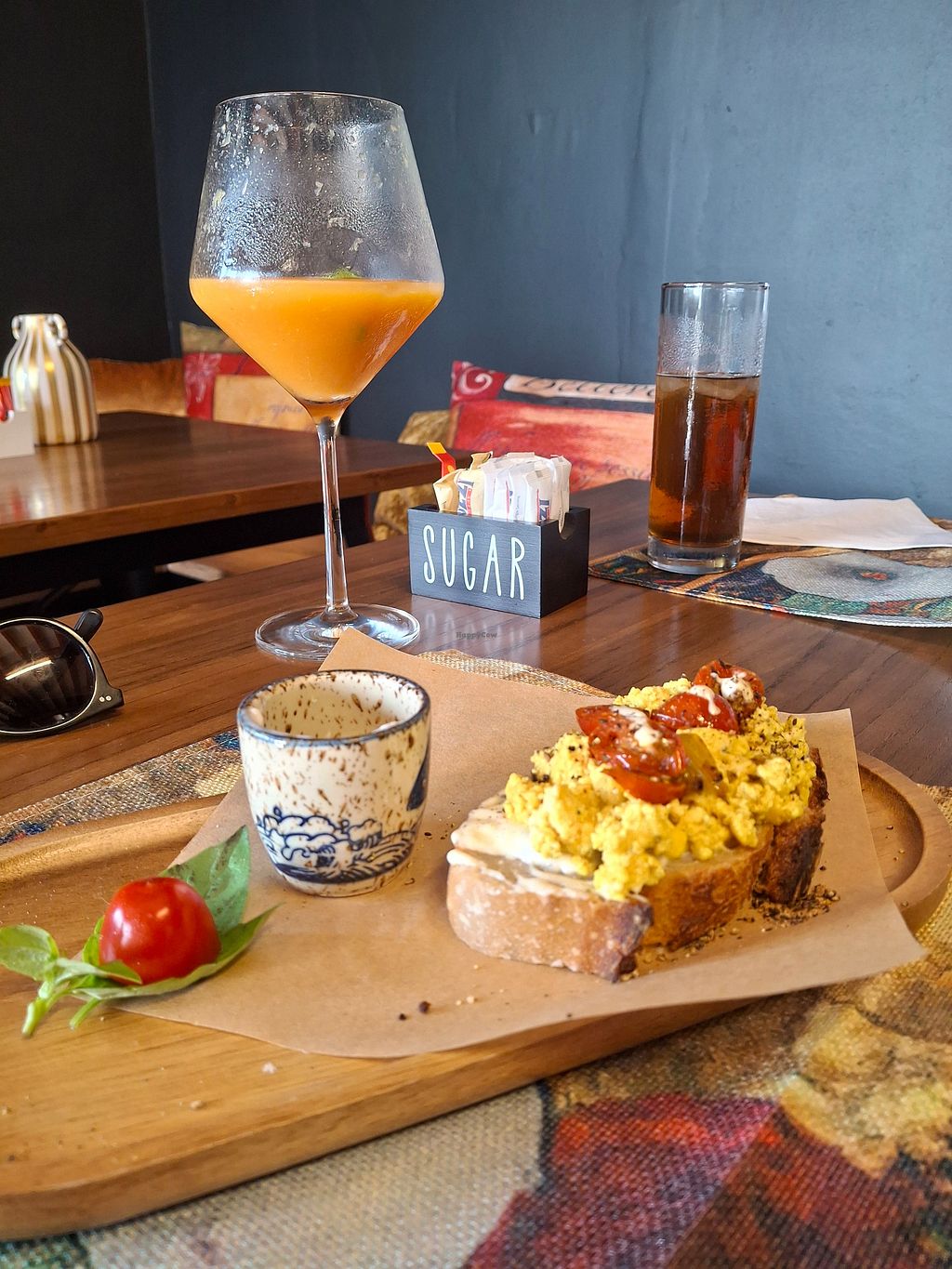 Tofu scramble on sour dough, and fresh fruit juice