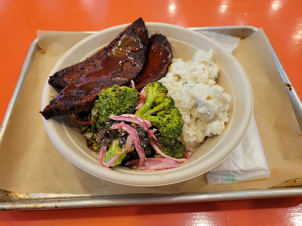 Newly opened vegan bbq, sandwiches, salads and sides. Close to Madison Park, the Flatiron area & the 4/6 line, this has a great small space and every bite is delicious. We got the Impossible “brisket” smoked main with the potato salad and coleslaw. Also got the open-faced chicken sandwich and a side of fries. Everything is great. So much so we ordered more to go!