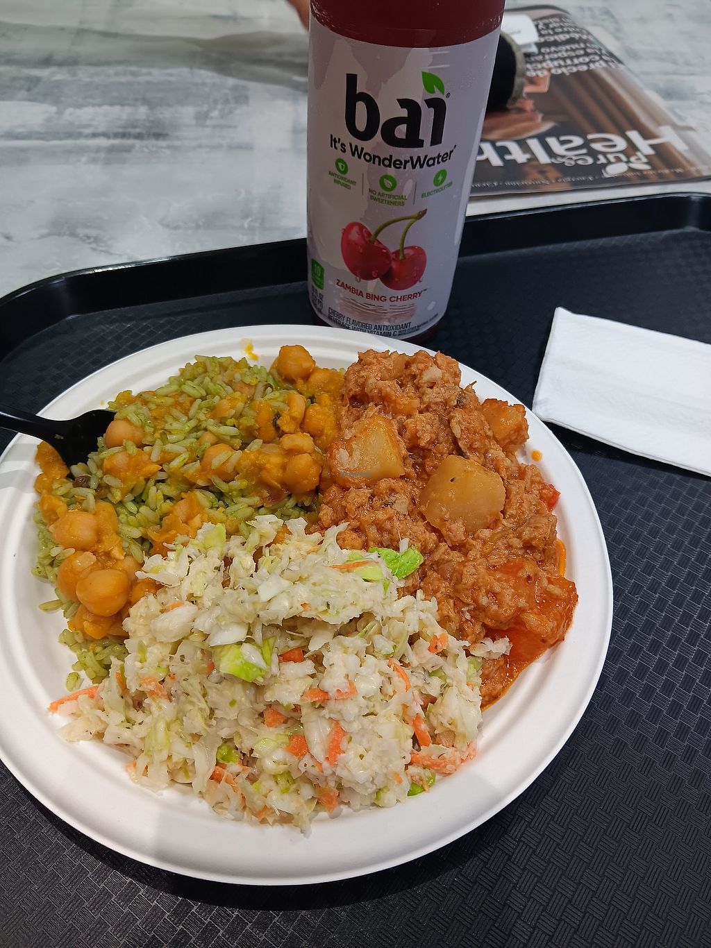 Arroz integral verde con garbanzos, tuno guisado (soya), repollo/coles…