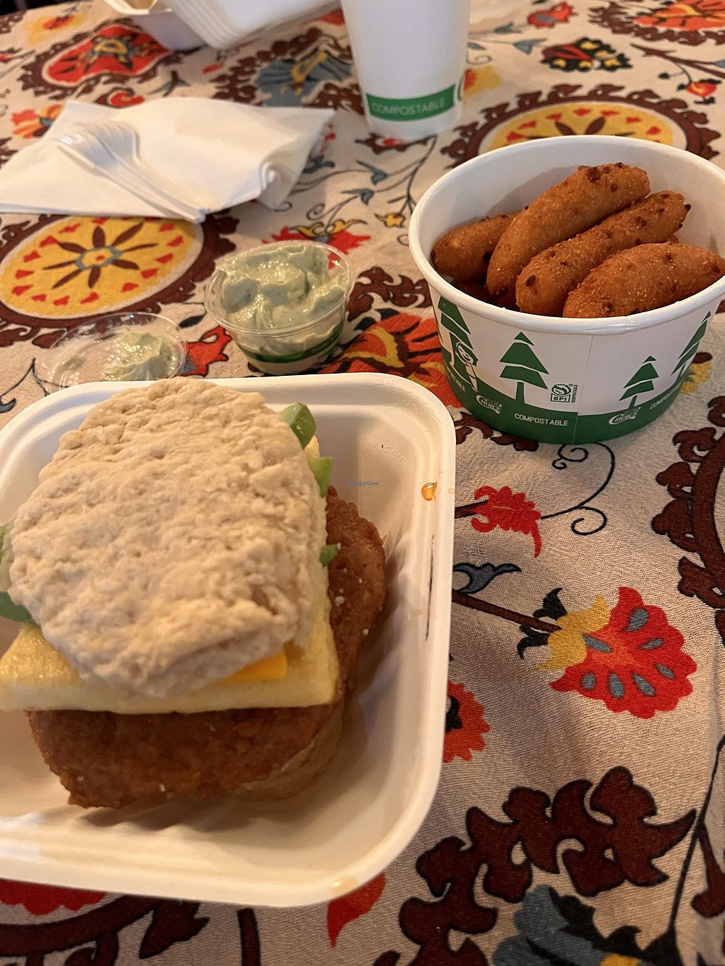 All vegan! Chicken Sammie with bacun, cheeze fries, and frodos veg