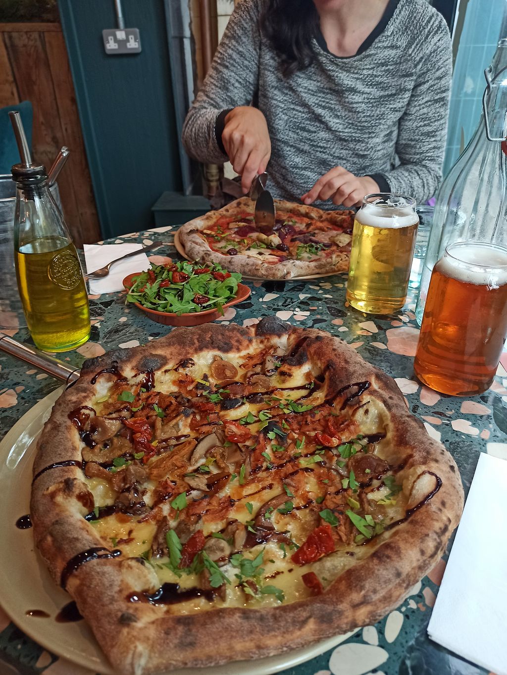 Lovely cafe style pizza place, delighted to see well behaved dogs were welcome. Staff were really attentive and friendly, a little expensive for the portion size and I found the mushroom pizza a bit stodgy. Overall a lovely place, nice food but I picked unwisely