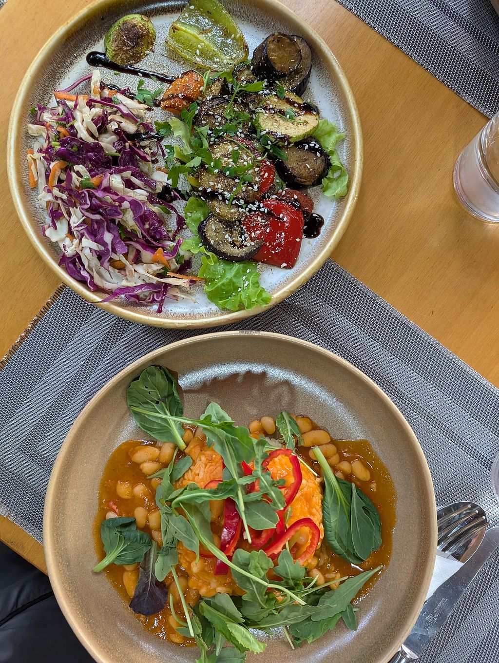 We both had the father's rice, which was really good and a big portion. You have to specify that you would like to have the vegan version. This comes with rice, beans, grilled vegetables and salad. We also had a bruschetta, which was really good, but we were (perhaps naively) surprised that the toppings weren't just tomatoes but also olives.