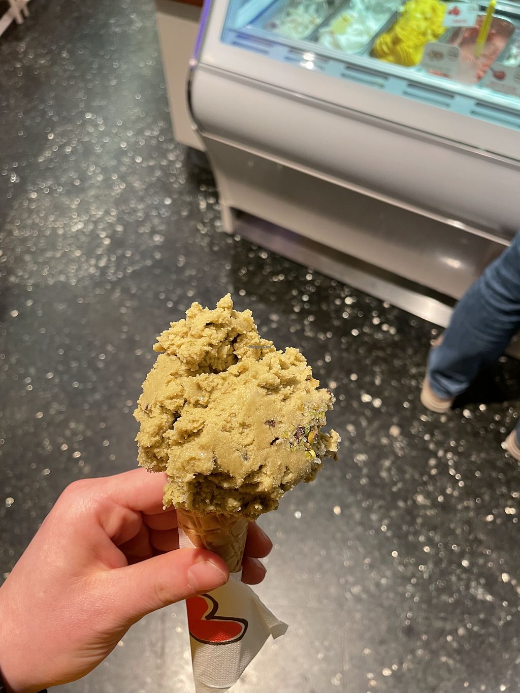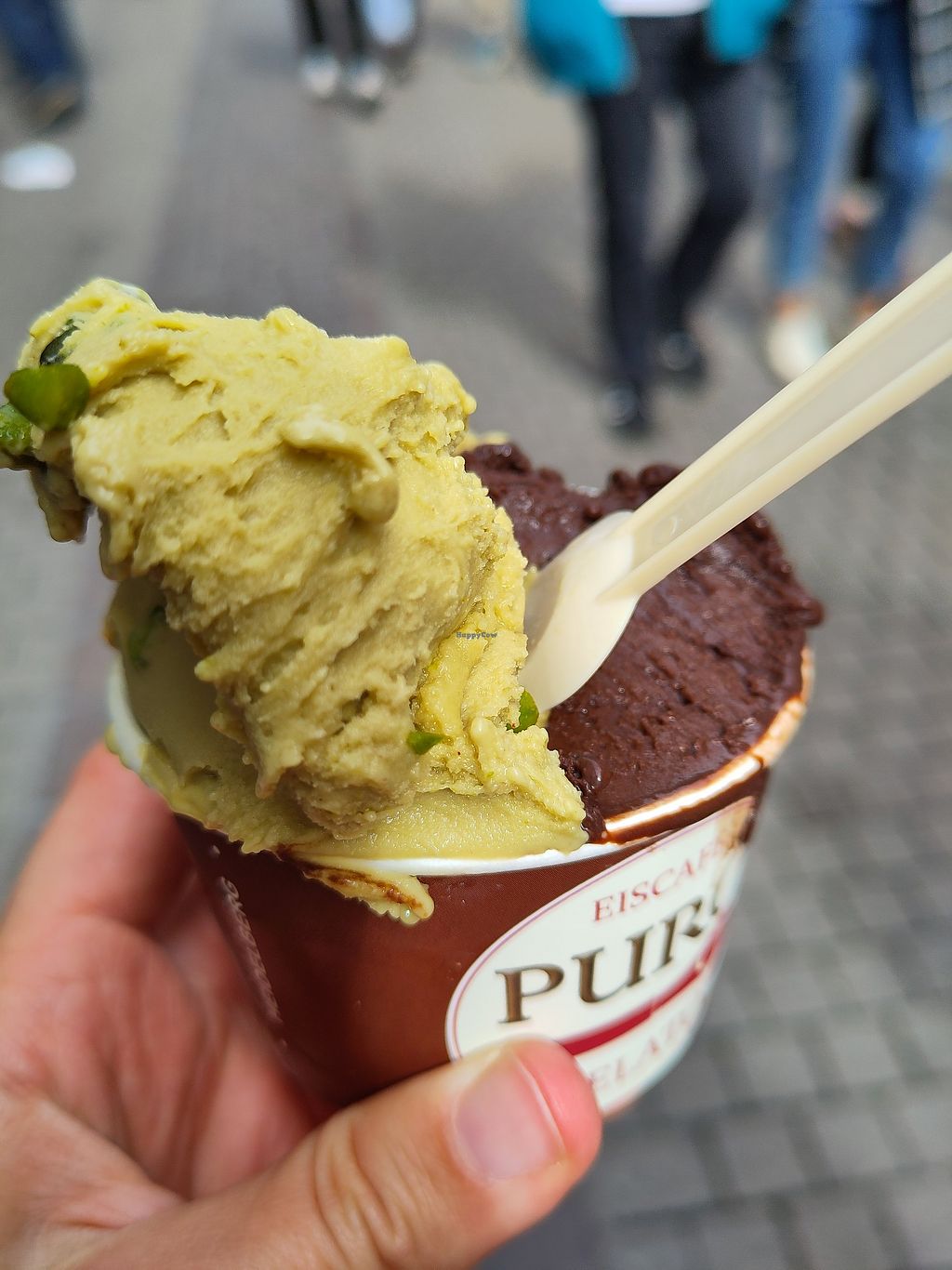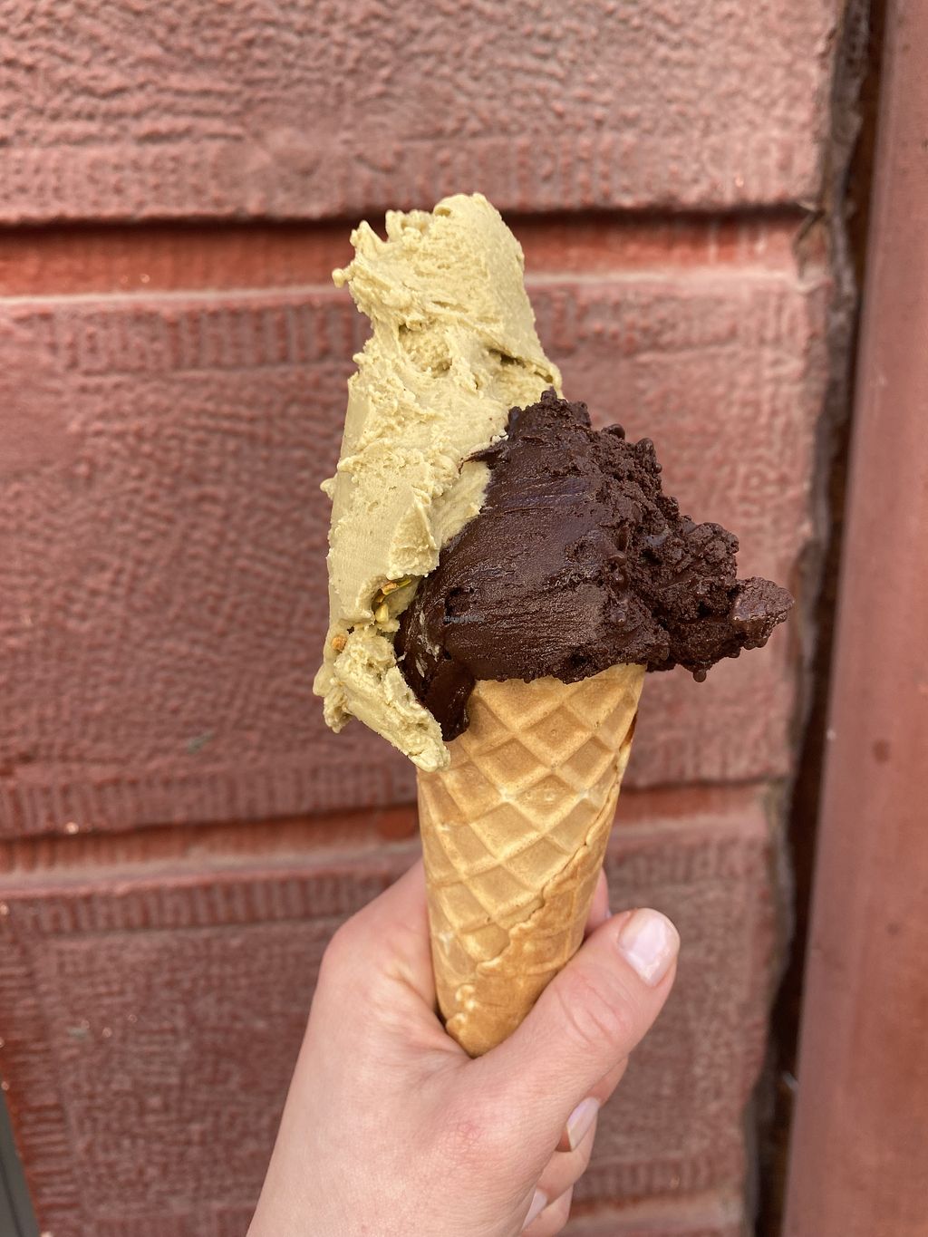 Vegan ice cream cone with hazelnut flavor (bottom) and pistachio flavo…
