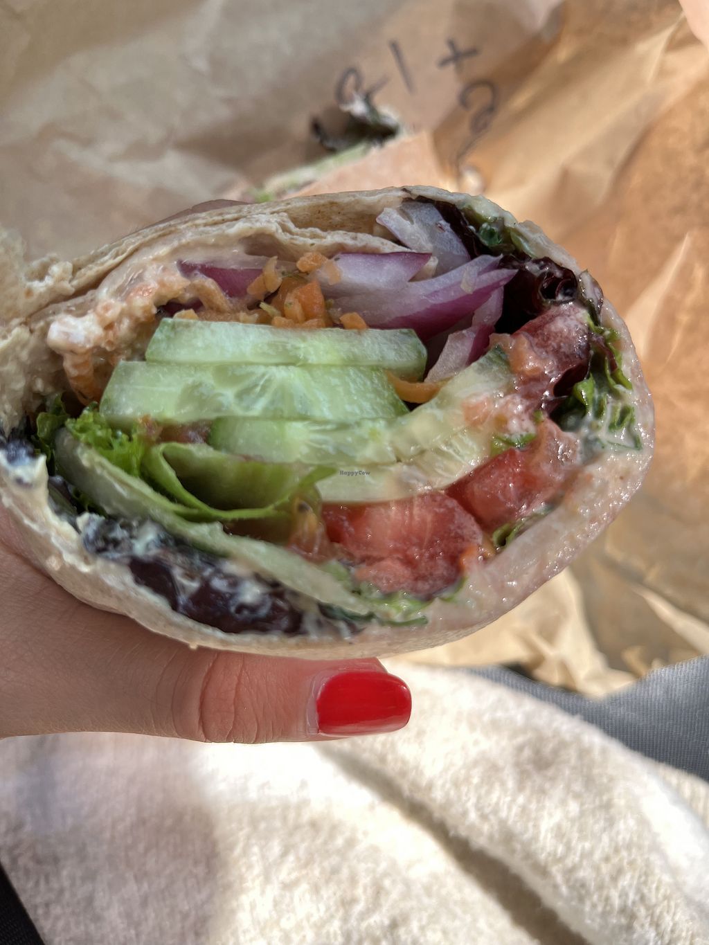 Veggie hummus wrap with pickled carrots added