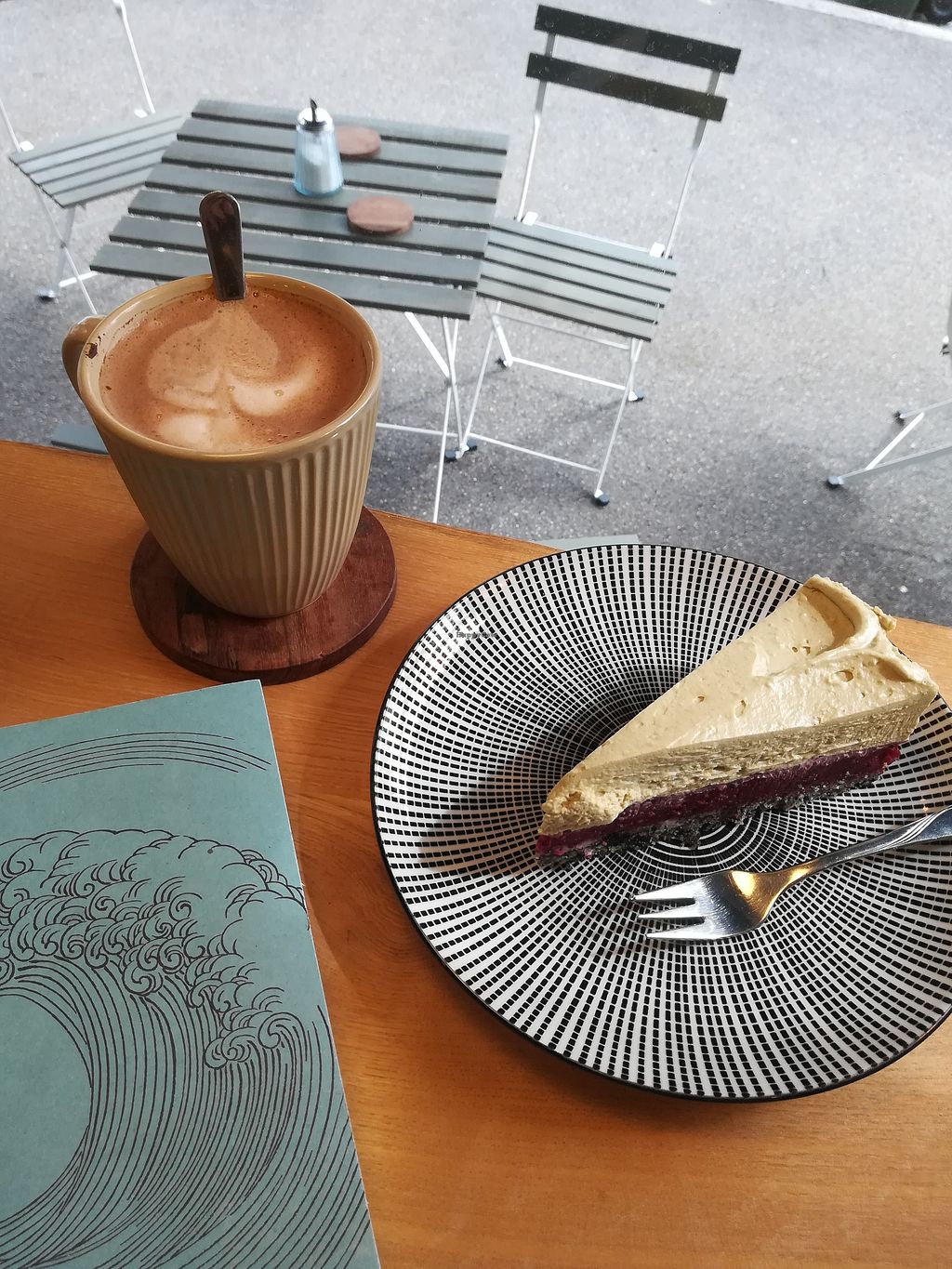 Alle Gäste wurden herzlich begrüßt und mein Eindruck war, dass sie viele Stammgäste haben. Mir wurde angeboten, die Süße meiner heißen Schokolade durch mehr Hafermilch oder Schokolade anzupassen. Die Kuchen sind mit Dinkelmehl bzw. glutenfrei und ohne raffinierten Zucker. Mein Stück Mohn-Waldbeer-Pistazien-Kuchen war ein Traum! Sie hatten auch verschiedene Sorten veganen Marmorkuchen und Kekse, als ich da war.