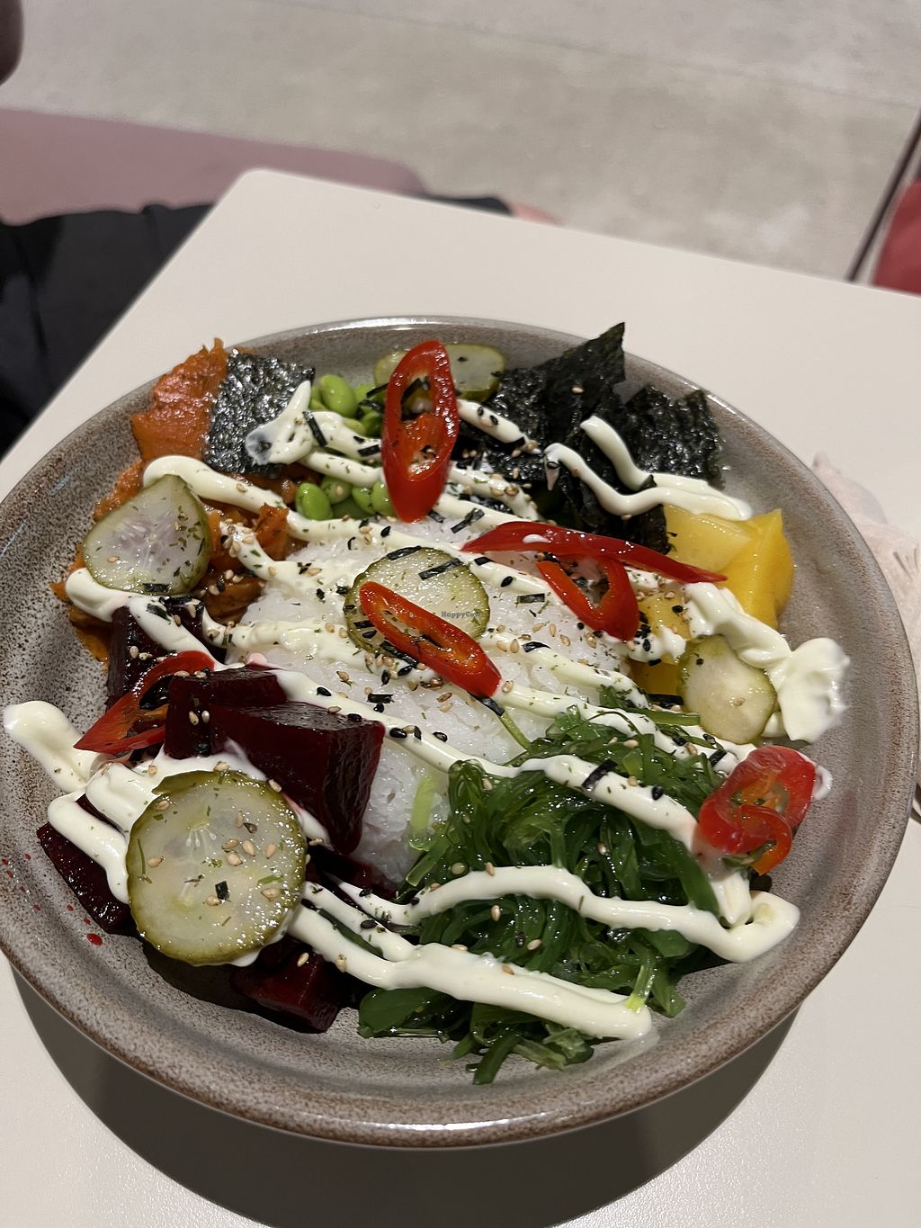 The vegan poke bowl is a, colorful option with good variety — crisp seaweed salad, pickled beetroot, edamame, rice, and a creamy vegan mayo drizzle. The fresh chilies add a nice kick, and the nori gives a boost. It’s nothing groundbreaking, but it’s a solid, option.