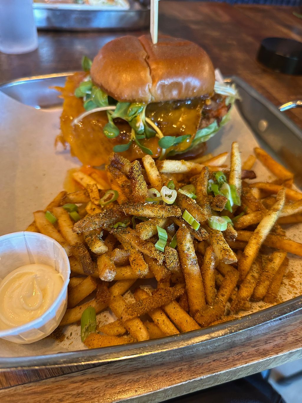 Vegan poutine, added grilled mushrooms in garlic, and a quinoa burger …