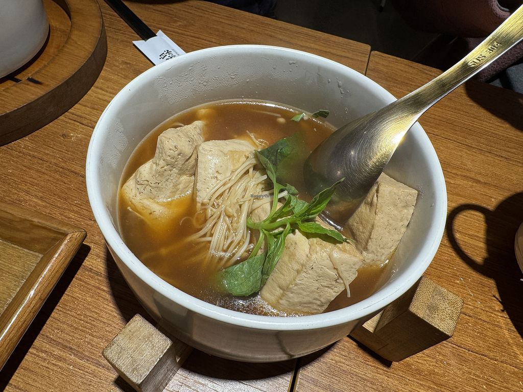 Really love the delicious comforting bowl of vegan vermicelli noodle soup. The broth, so good. Also loved the sides (vegan smoked goose and shredded tofu with ginger, celery) and desserts (purple rice with chickpeas)..everything was good!