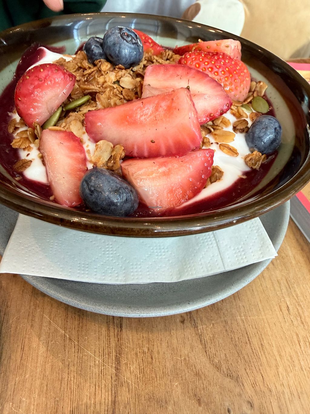 Serves meat, vegan options available. Hotel restaurant with a variety of clearly labeled vegan (V) options like vegan scrambled "JUST eggs" plate, steel-cut oatmeal with raisins and berries, and veganizable avocado toast. Open Mon-Sun 6:00am-2:00pm, 5:00pm-10:30pm.