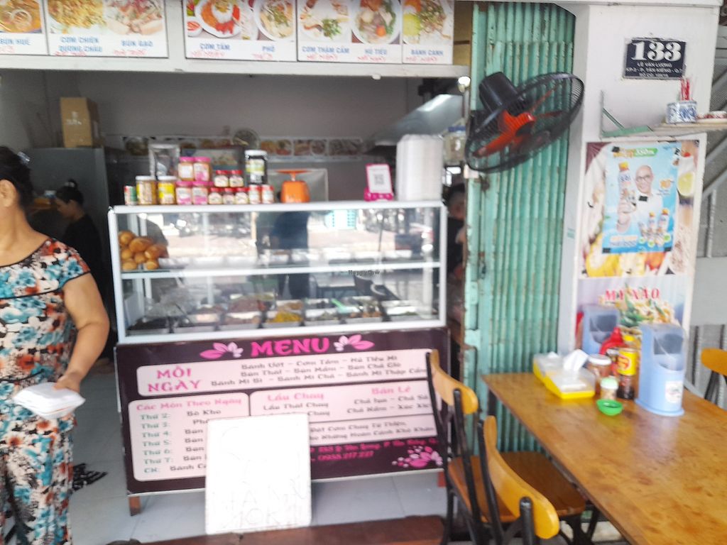 Fully vegan restaurant serving traditional Vietnamese food. Sells many iconic dishes like freshly cooked com tam and other rice dishes. Also iconic pho chay and other noodle soups. A com chay stall dominates the restaurant inside. Seating is all outside. No menu in English but does have pictures of some of the food. Plenty of drink options including many milks. Limited English spoken. Payment by cash or bank transfer. Open Mon-Sun 6:00am-10:00pm.