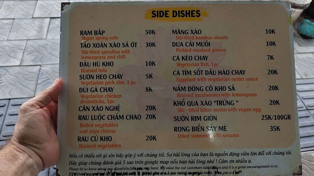 Delicious roadside restaurant with good portions and all for a great price. I'll definitely be coming back (lots)! The menu is in English (though it's not that descriptive haha - I went for the 'special rice,' which was 35K and came with different veggies, a small soup side, and mock meats)