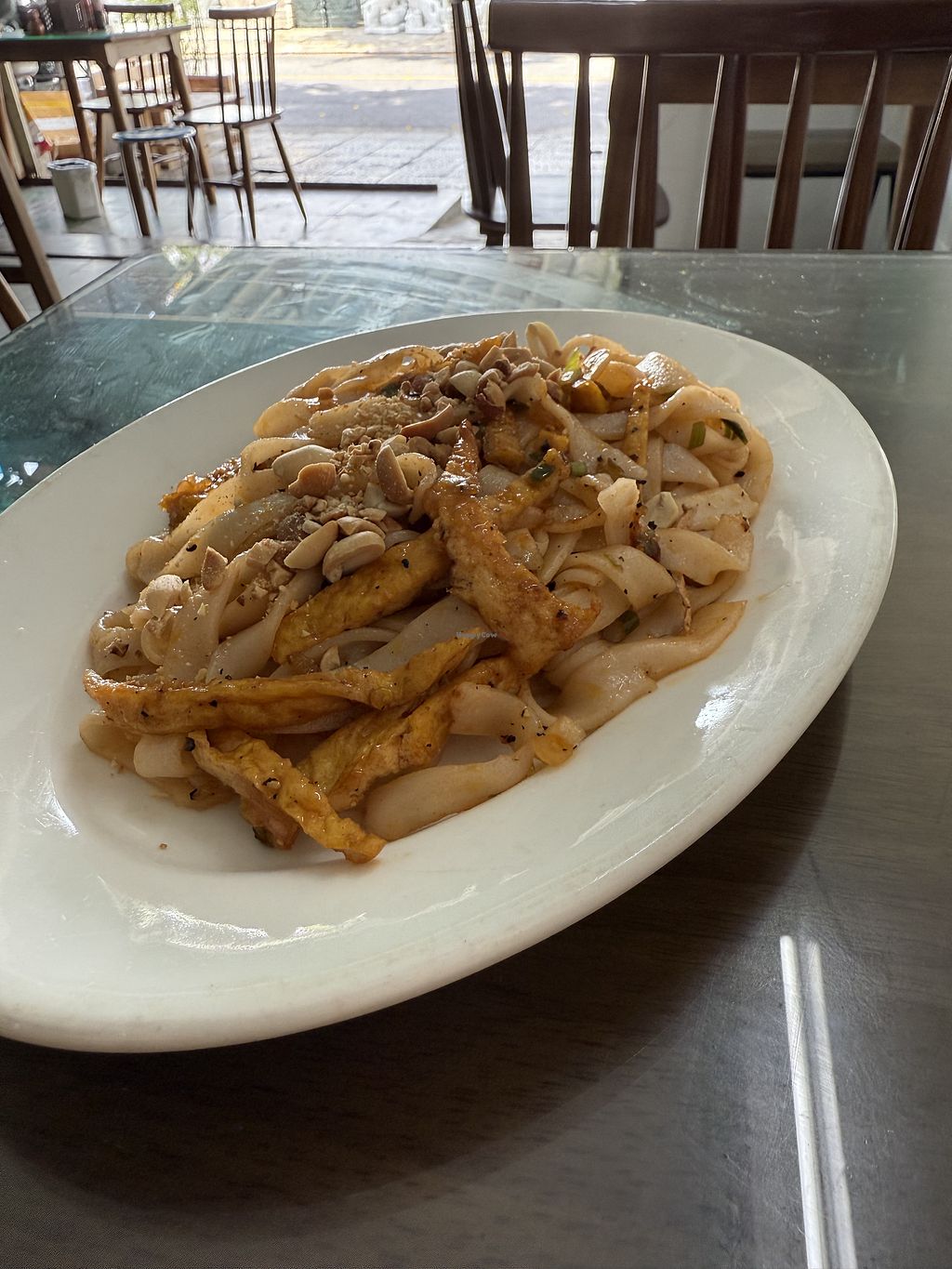 Stir fried flat noodles with tofu and peanuts