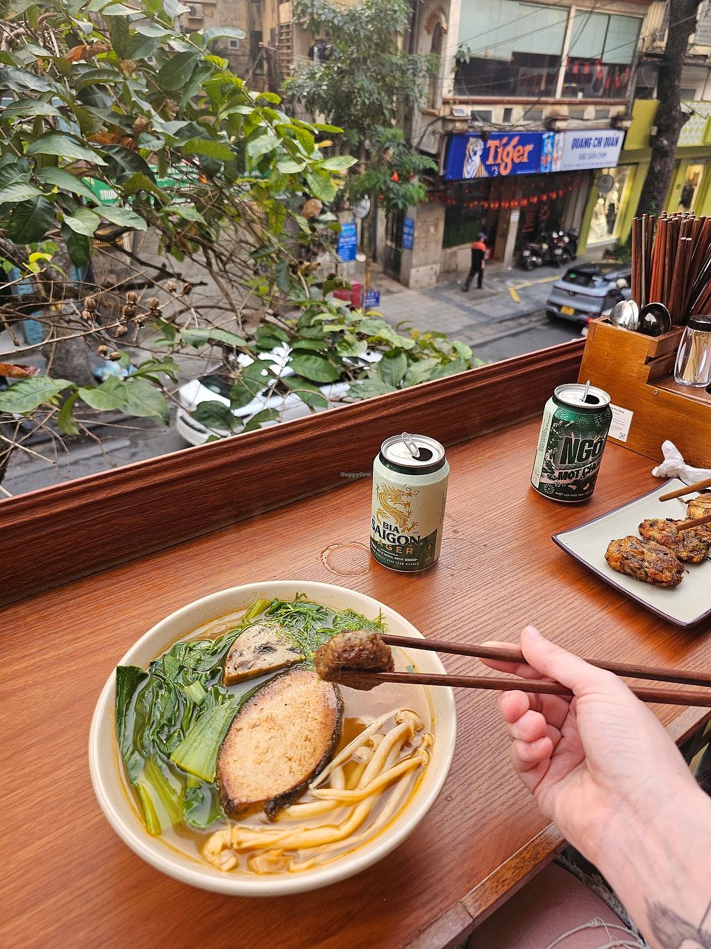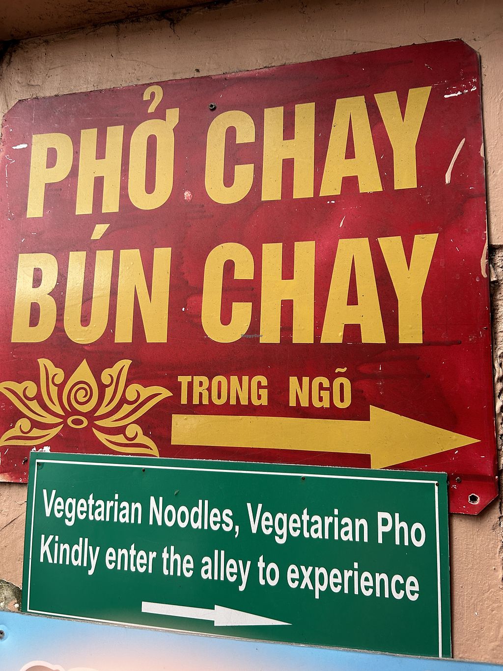 Vegan pho, fried donut sticks (not sweet), and hot sauce.