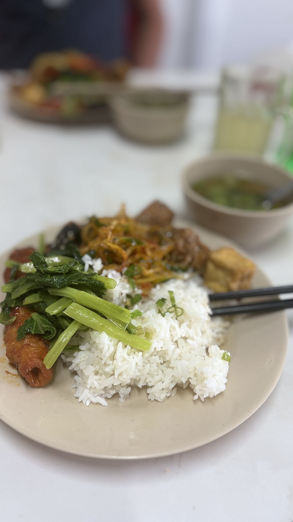 Plate with rice and selection of meats and tofu. Comes with a soup