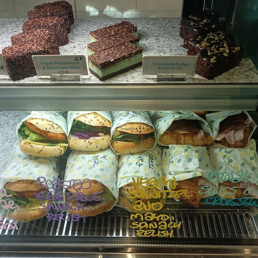Clear labelling for vegan goods and helpful staff too! I saw hot savoury pastries (pies, rolls), sandwiches and sweet slices and lamingtons. A pretty decent selection.