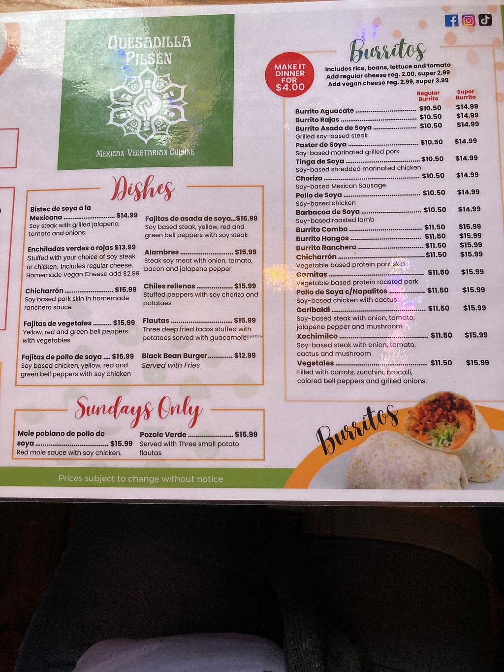 I've been here a few times over the last year. I really appreciate that there's a vegetarian/vegan resturant in Pilsen that tries to emulate the flavors I grew up with. With that being said, I do think a lot of their stuff is expensive compared to neighboring restaurants. A decent portion of the dishes don't come with rice or beans, and if you do want them, expect to pay an extra $4 (at least) for a half cup of each. Something else that really irked me was when I ordered the red enchiladas. The sauce was just the same habanero salsa they served with chips. I thought it was pretty lazy considering that red enchiladas are made with different chiles that have a different flavor profile. Overall I think it's a nice place to come and eat every once in awhile, but I don't crave it as much as other restaurants.