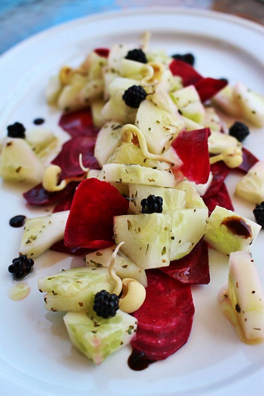 Cucumber and beetroot salad with blackberries and beans sprouts