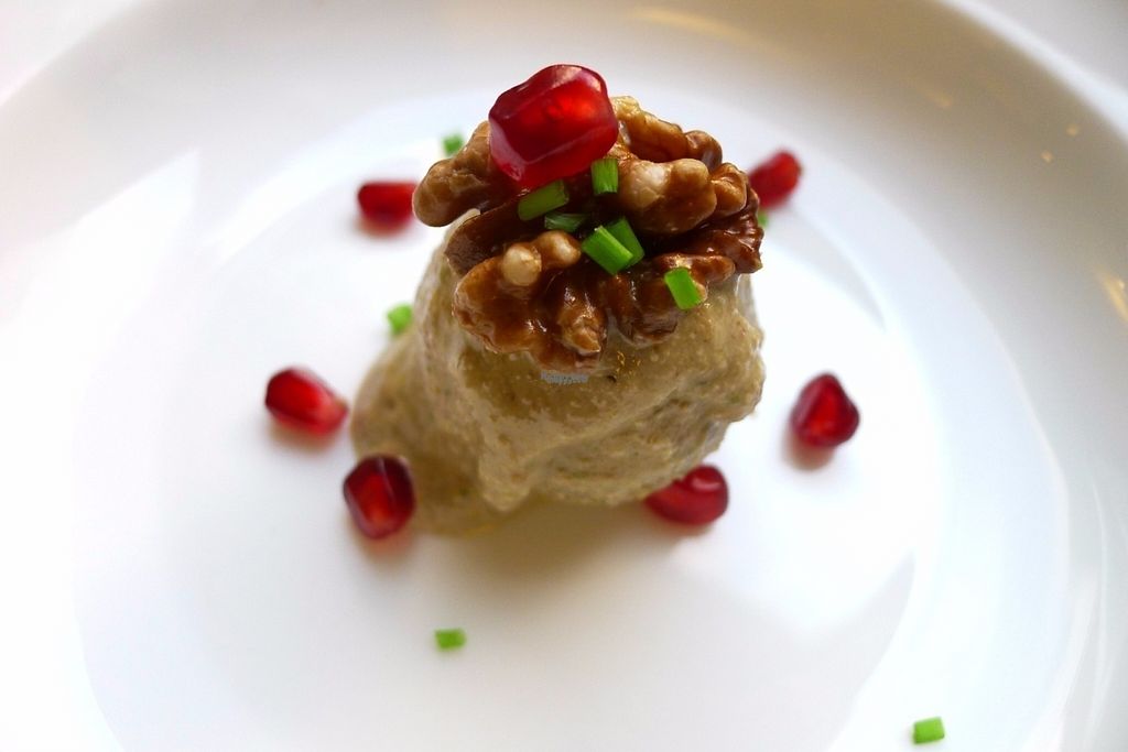 Cereal spheres with almonds sauce, walnut and pomegranate