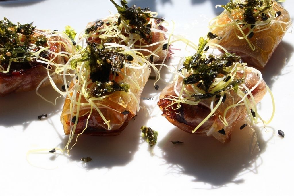 Red cabbage rice rolls with fried algae and garlic sprouts