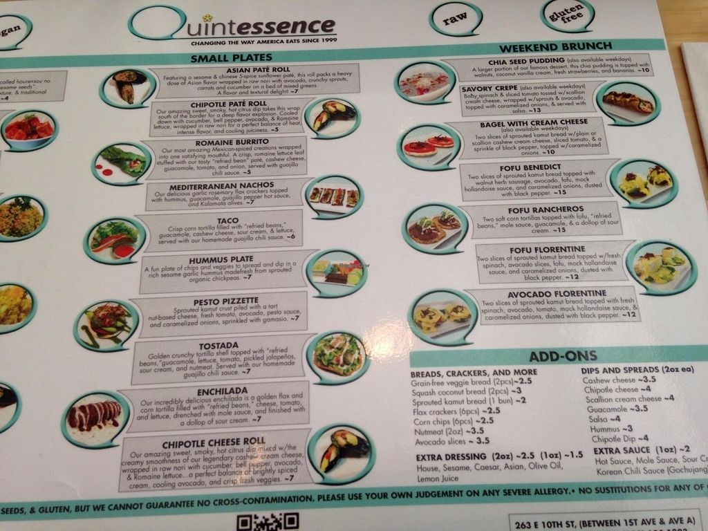 Admittedly, I haven't gone to Quintessence in my eating journeys in NYC because it is a raw restaurant. However, this place makes raw look and taste good, really good. Raw food has a new face - it is not just salads and fruit, it is what this mainstay in the raw vegan NYC scene dishes up artfully, affordably and compassionately. If you have never given raw a run, go here. If you are a raw foodie, you have been here or you will go here and be happy, very happy.