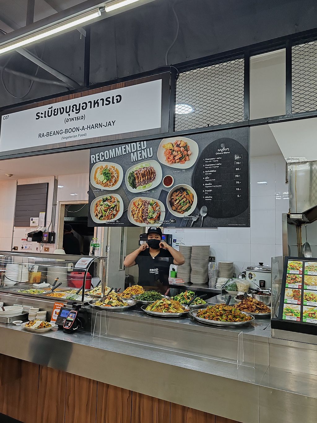 The 6th-floor food court at features a dedicated vegetarian stall offering a variety of plant-based dishes. A typical set meal includes brown rice, and a main dish, all for around 65-85 Baht.