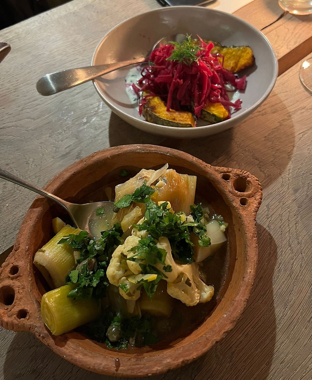 Braised leeks and cauliflower and roasted squash with vegan mint yoghu…