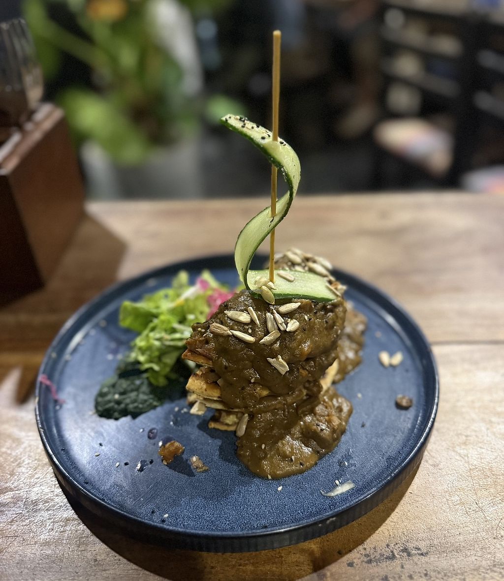 Very cool little place over 3 floors. I had the tofu burger on a bagel and vegan coleslaw and my BF had the crispy mushroom burger. Both really tasty and decent sized portions😄you might need to wait a little while for a table (we waited about 15 mins) but worth it! They also donate some of the tips to Dogs of Ella which is very cool 😎