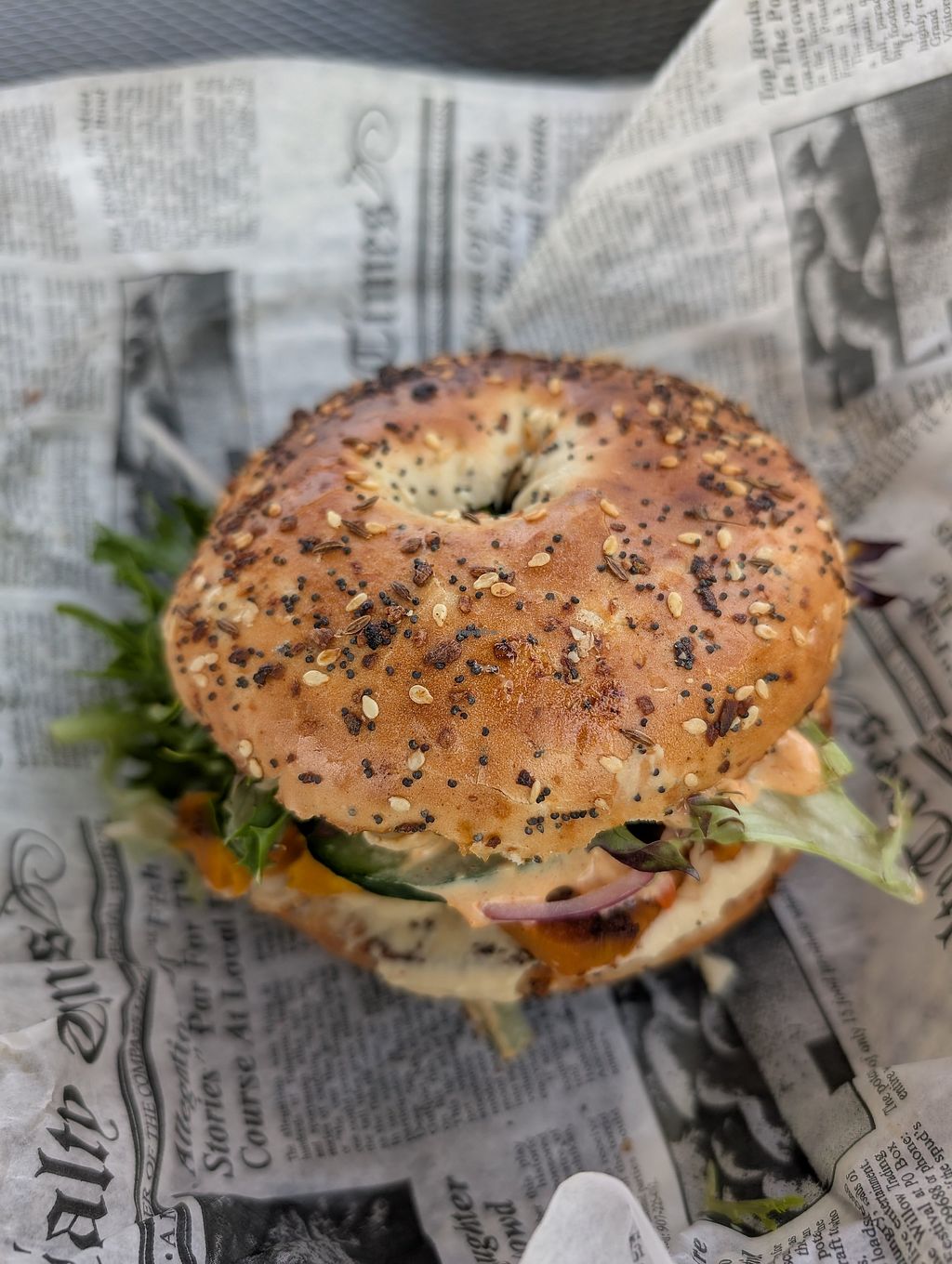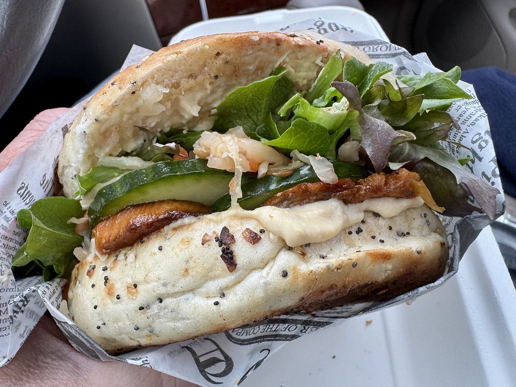 Ordered the veggie toasted bagel sandwich with has roasted sweet potato, greens, cucumber, hummus, pickled carrots and remoulade. Super delicious!!
