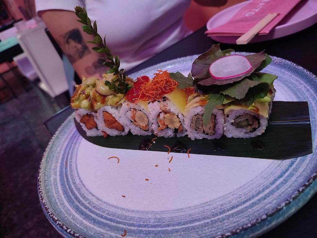Il menù presenta diverse opzioni completamente vegetali in cui vengono utilizzate benissimo diverse verdure. Hanno anche un'alternativa al salmone e una al gamberetto fritto, ma soprattutto la prima meriterebbe pezzi come sashimi in cui viene messa in risalto essendo piuttosto difficile da trovare in altri posti :(